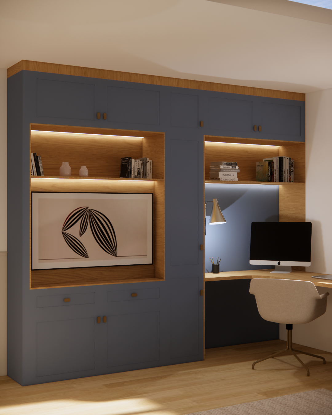 Dans le cadre de la construction d’une maison, l’objectif des clients était d’anticiper les aménagements intérieurs. Ici, la pièce devait répondre à trois problématiques : avoir un bureau confortable pour le télétravail, pouvoir se transformer en chambre d’ami avec TV pour accueillir les amis ou famille et intégrer du rangement. Tout le mobilier a été créé sur mesure pour répondre aux problématiques des clients.
