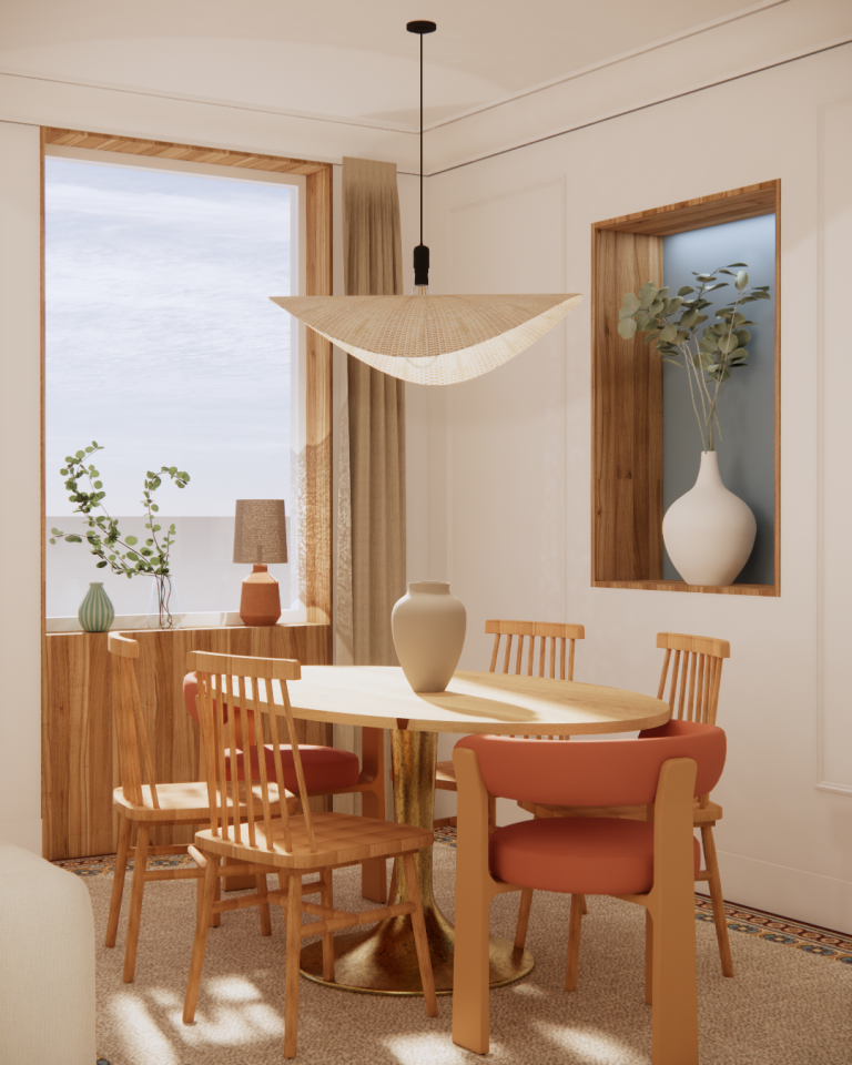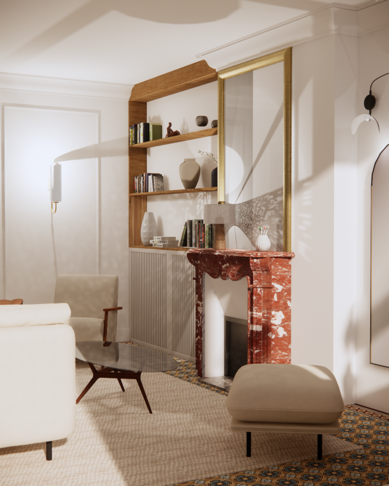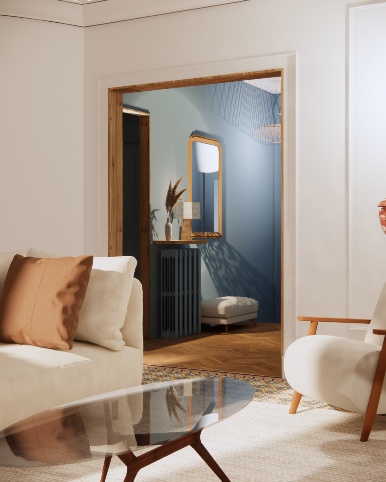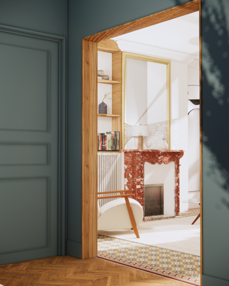 Pour ce projet de rénovation, les clients souhaitaient conserver le charme existant tout en apportant de la modernité à leur maison. Nous avons donc conservé les carreaux de ciment, les corniches, la cheminée ancienne. Pour le reste, nous avons recréé le charme de l’ancien avec des moulures, parquet bâton rompus, tout en modernisant avec du mobilier sur-mesure et des finitions en chêne. Nous avons joué avec des nuances de bleu et beige, assorties aux carreaux de ciment d’origine. L’aménagement a lui aussi était repensé en inversant les espaces salon et salle-à-manger.